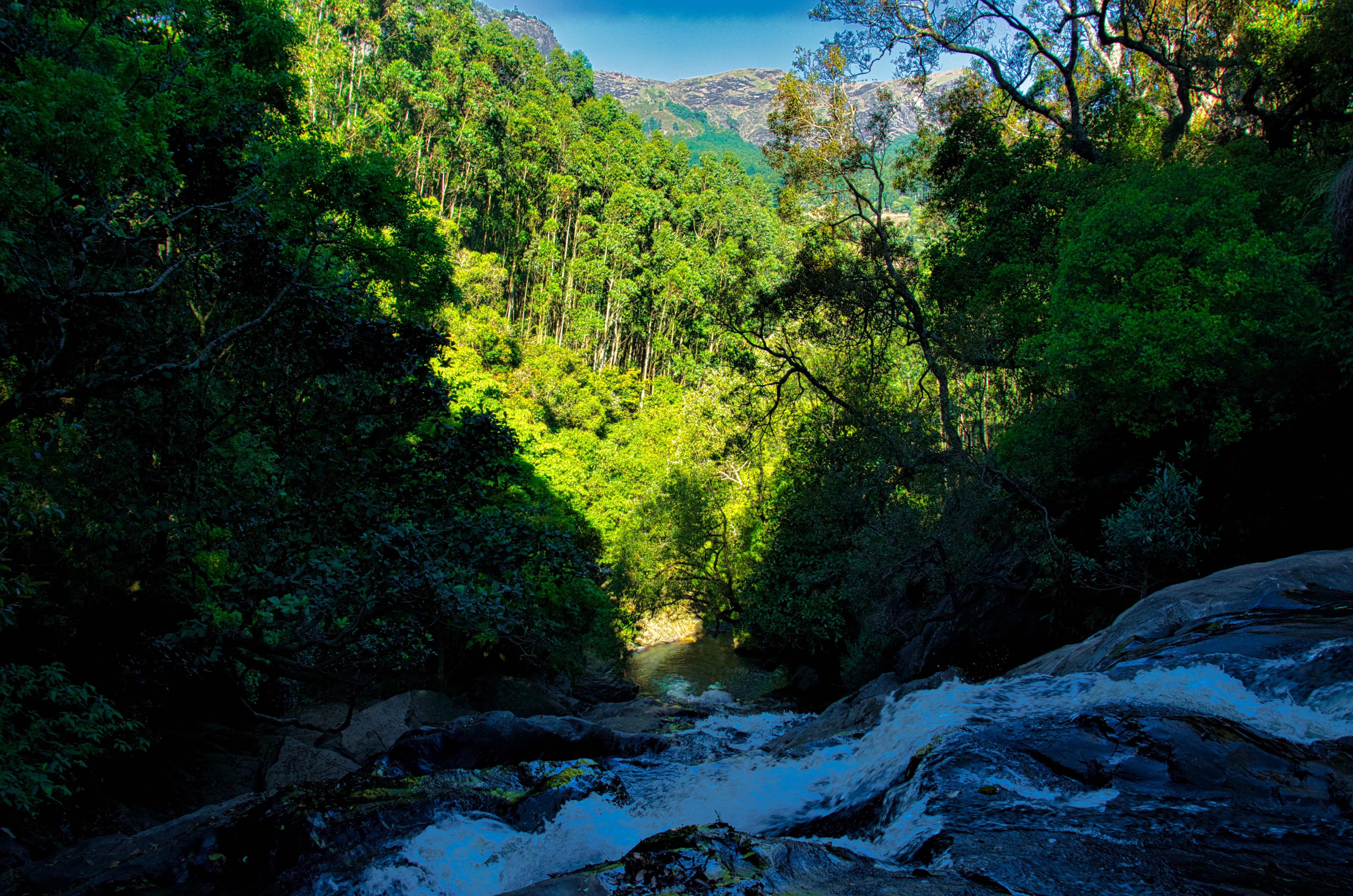 I continued my journey until I reached Mamalakandam High School, located in a scenic valley. The school is known for its breathtaking views, which can be seen in many images and videos online. From there, I headed towards Anakulam, where elephants come to drink water every evening. The roads were good for a bike ride and almost empty. I saw a few water streams and waterfalls on the way. I reached a dead-end beyond which there was a tribal colony.